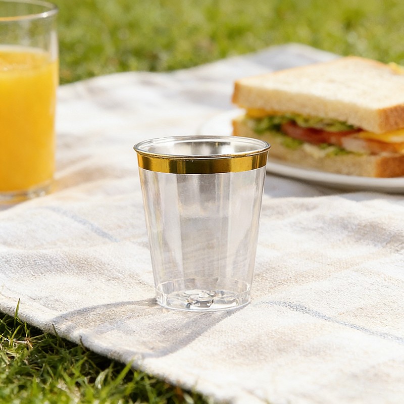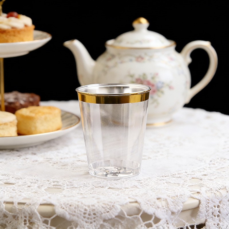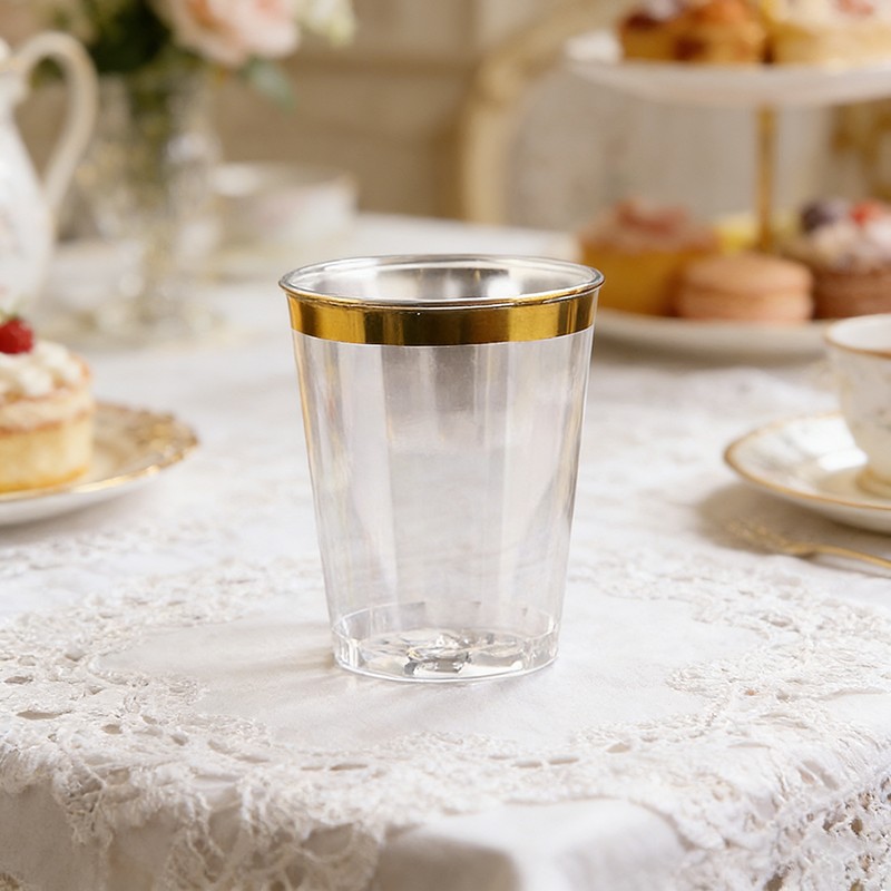 clear cup + gold rimسعة مثالية تبلغ 10 أونصاتحجم مثالي 10 أونصة للنبيذ والكوكتيلات والمشروبات والحلويات ومشروبات الحفلات، مناسب لجميع أنواع الاحتفالات.