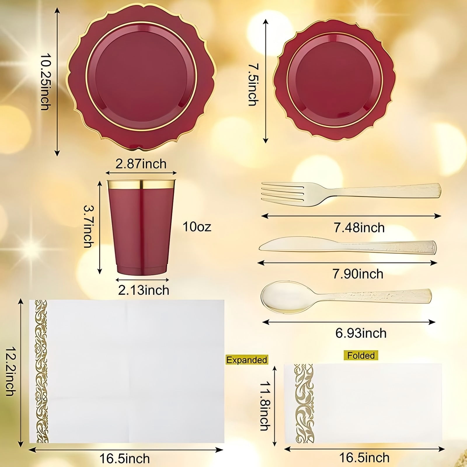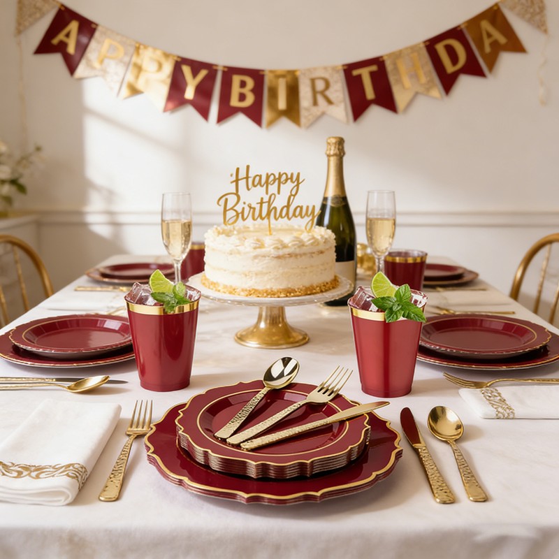 Classic burgundy base with shiny gold rim, elegant and upscale, creating a romantic and luxurious table setting for formal events.