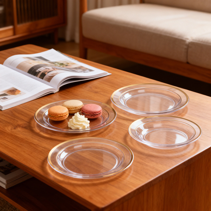 ✨طبق عشاء بلاستيكي شفاف بحافة ذهبيةطبق أنيق للاستخدام مرة واحدة مع لمسة معدنية فاخرة