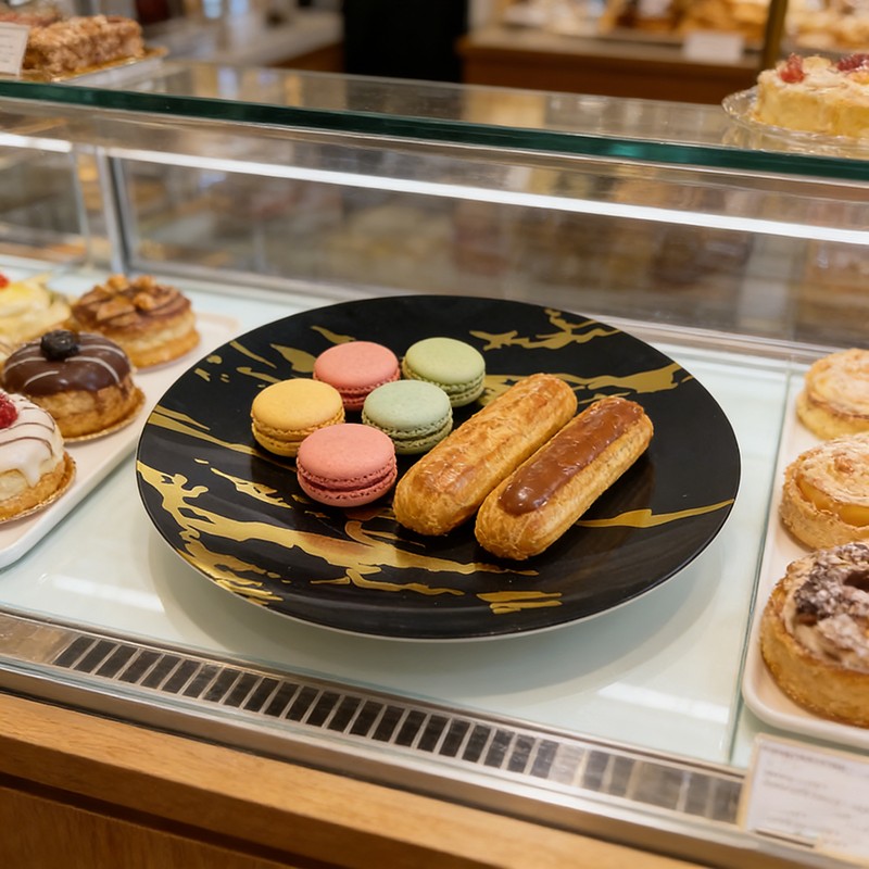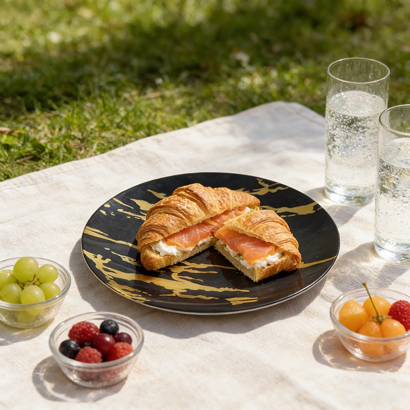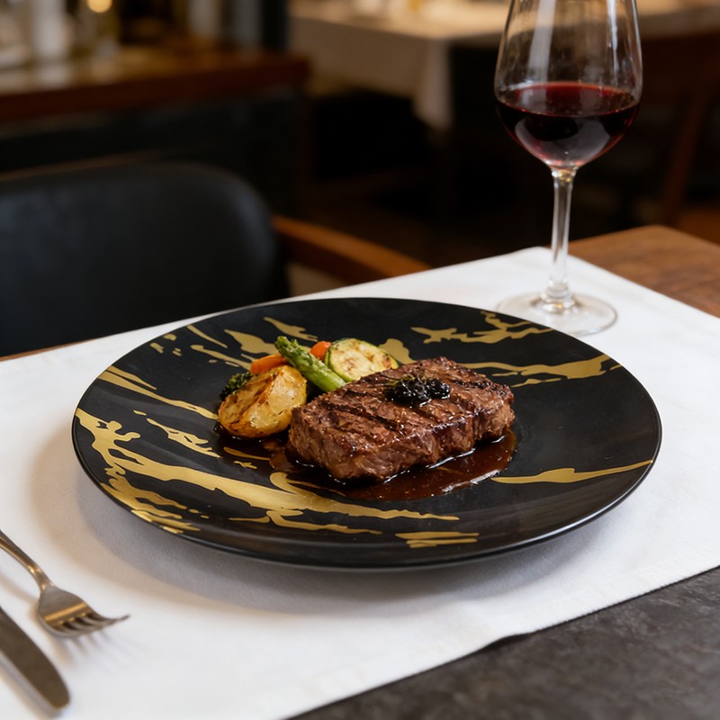 تُضفي عروق الرخام الذهبي الجريئة والمنسابة على قاعدة سوداء لامعة مظهرًا عصريًا فاخرًا يُحاكي أواني الطعام الحجرية الفاخرة. تُعد هذه الأطباق مثالية لحفلات الزفاف الفخمة، وولائم الشركات، واحتفالات الأعياد، فهي تُضفي لمسة راقية على أي مائدة وتتناسق بشكل رائع مع أدوات المائدة المعدنية ومناديل الكتان.