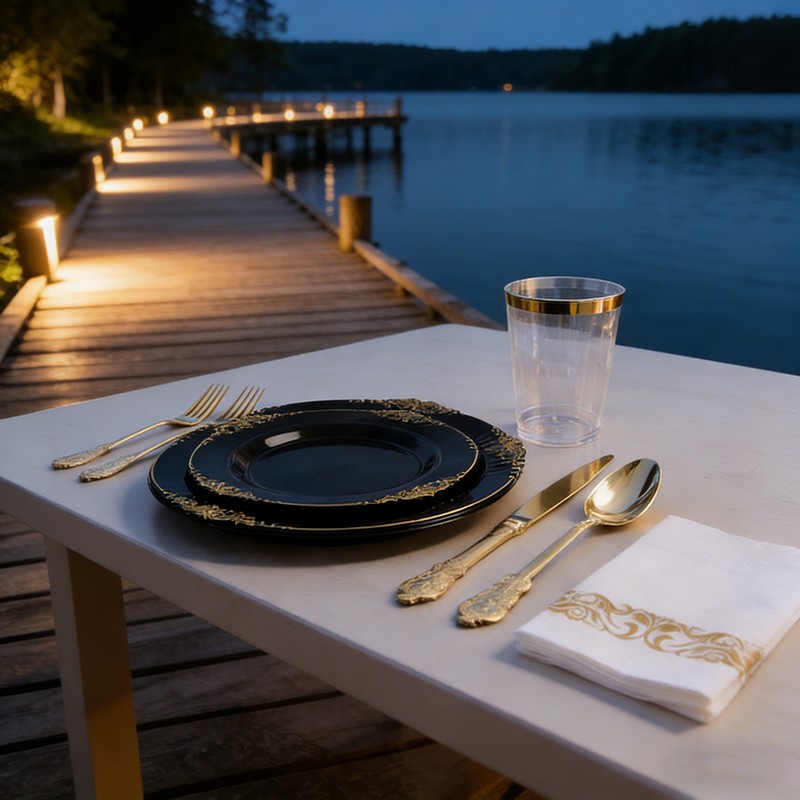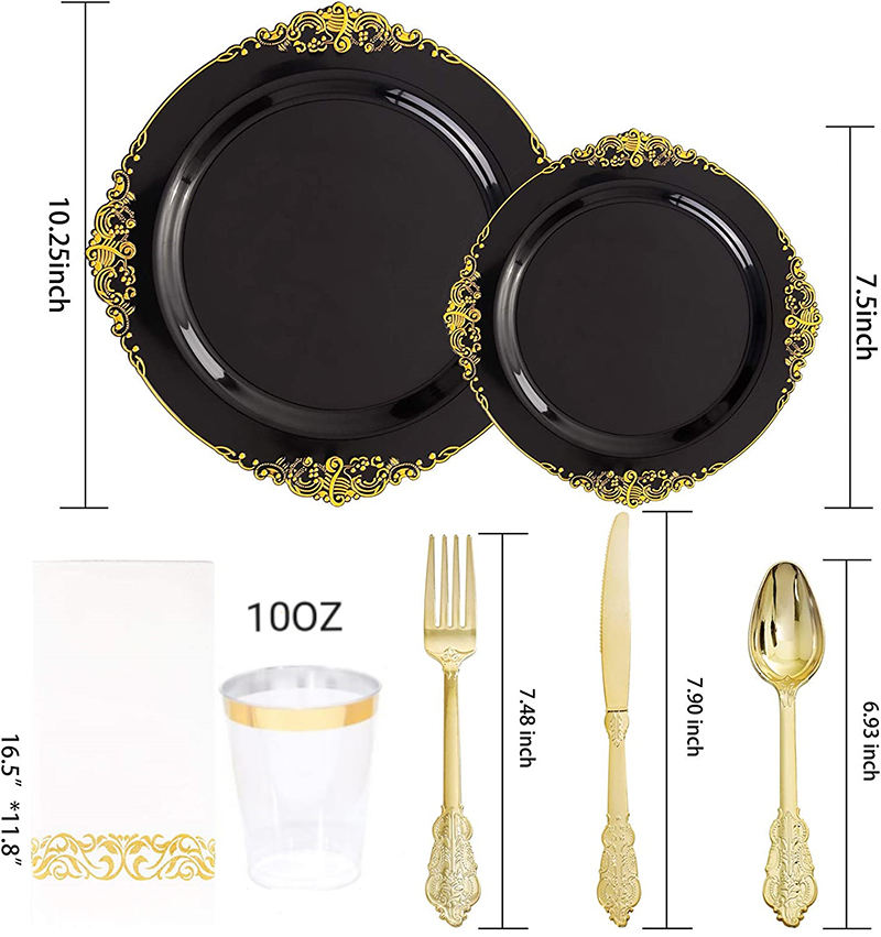 500 setsLuxury Black & Gold Design: Sophisticated black base with shiny gold rim, modern and upscale, perfect for luxury weddings, formal parties and high-end events.