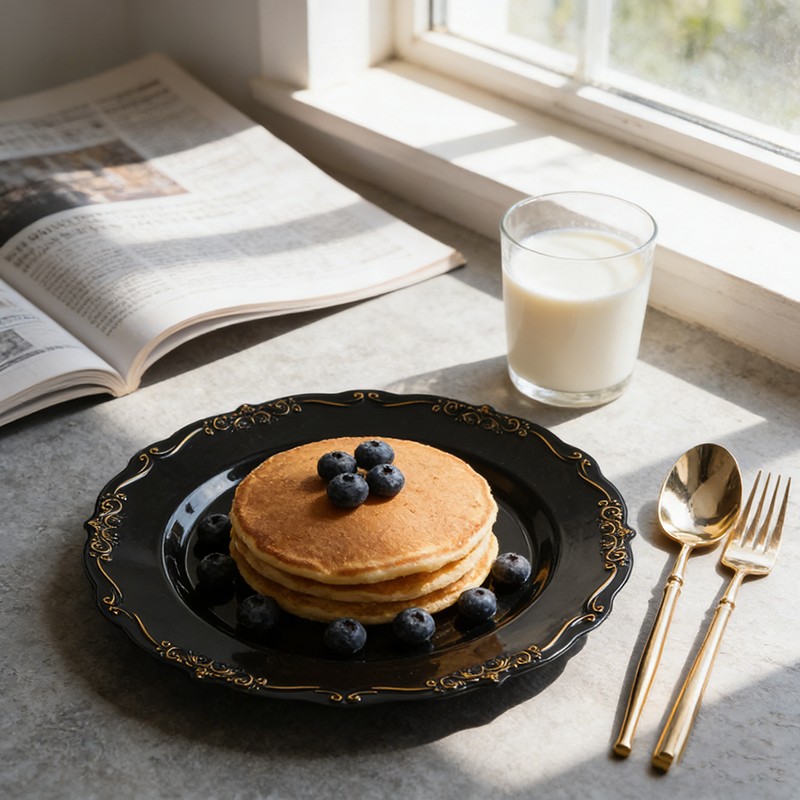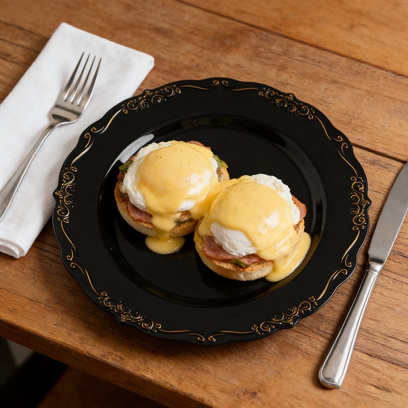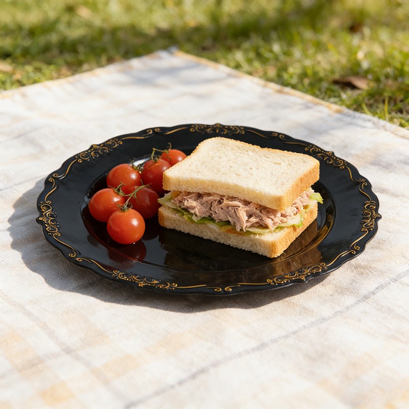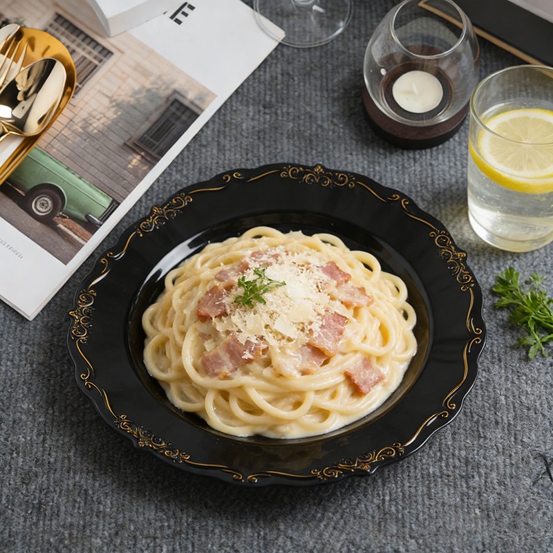 تُضفي القاعدة السوداء الكلاسيكية مع الحواف الذهبية اللامعة لمسة جمالية على أي مفرش طاولة، أو تنسيق زهور، أو ديكور - بدءًا من حفلات الزفاف العصرية ذات الطابع البسيط وصولًا إلى الحفلات الملكية التقليدية. كما تُعدّ هذه الأطباق مثالية للحفلات ذات الطابع الخاص، وعشاء ليلة رأس السنة، واحتفالات الذكرى السنوية.