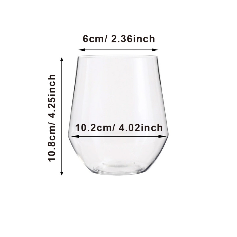H10.8cm*W10.2cm*6cmCrafted for wine lovers and party hosts who refuse to compromise on style or safety. Designed with a sleek, stem-free silhouette that offers unmatched stability (no more wobbly stems!), they blend the crystal-clear transparency of traditional glassware with the durability of food-grade plastic—perfect for sipping red wine, white wine, rosé, or even cocktails at parties, dinners, or casual get-togethers.