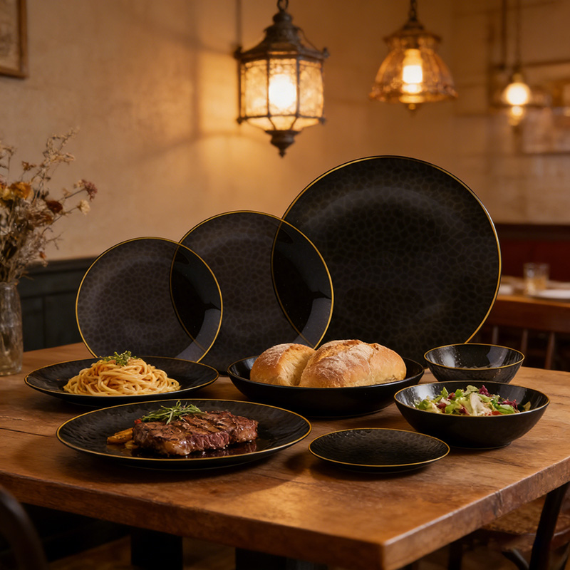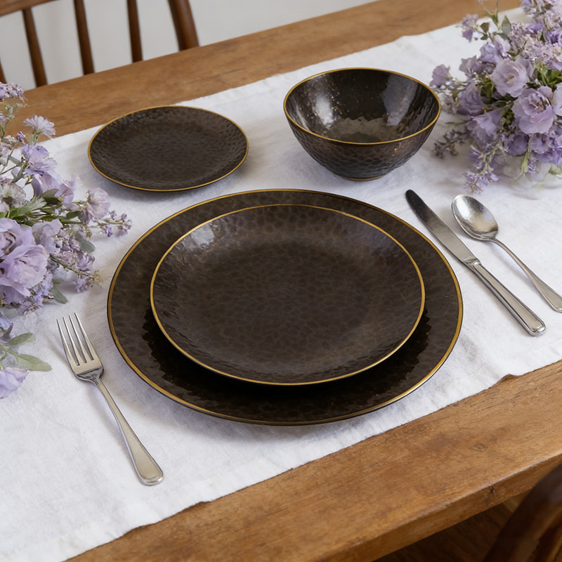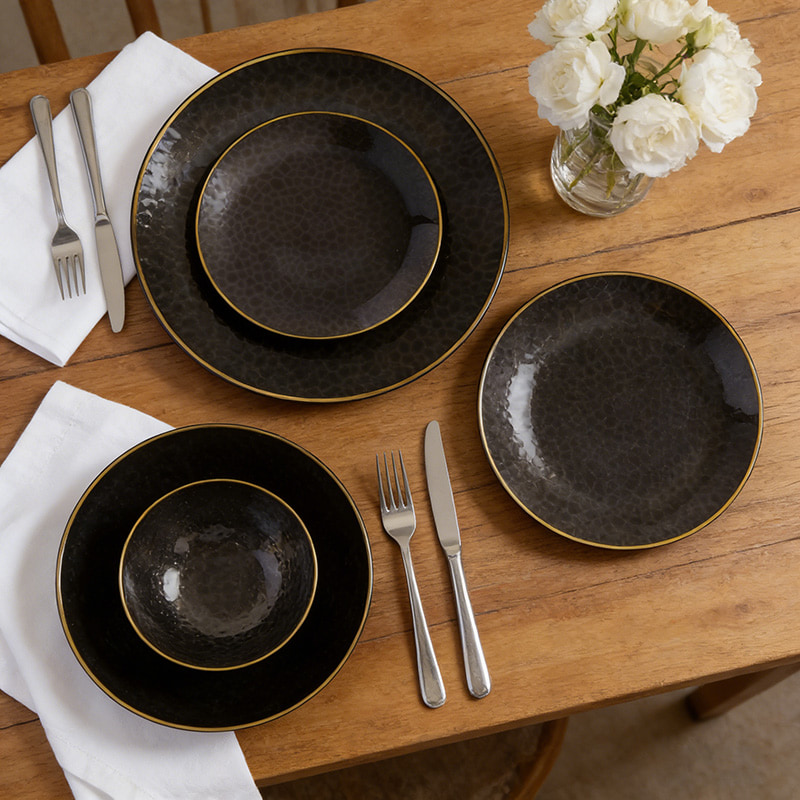 clear black plate with gold rimجماليات راقية: نسيج مطروق + حافة ذهبية تحاكي الأواني المعدنية الفاخرة، مثالية للمناسبات الراقية.
