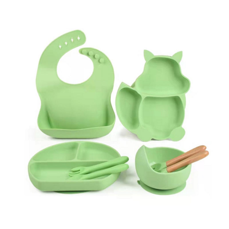 Customizedمجموعة فوكس الكاملة:يتضمن لوحة شفط، ووعاء شفط، ومريلة سيليكون، وملعقة من الخشب الطبيعي، وملعقة وشوكة إضافية.