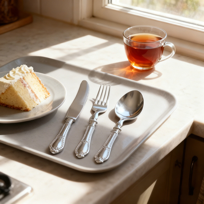 تصميم أنيق عتيق: تتميز بنقوش عتيقة معقدة على المقابض ولمسة نهائية فضية لامعة تحاكي أدوات المائدة المعدنية المصقولة، مما يضفي لمسة من الرقي الكلاسيكي على أي طاولة.