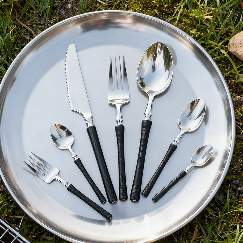تصميم أنيق متباين: يتميز بمقبض أسود محكم الملمس (غير قابل للانزلاق ومريح للإمساك) مقترن بلمسة نهائية فضية مصقولة على الأطراف العاملة، مما يخلق تباينًا عصريًا جريئًا يرتقي بجماليات ديكور الطاولة.
