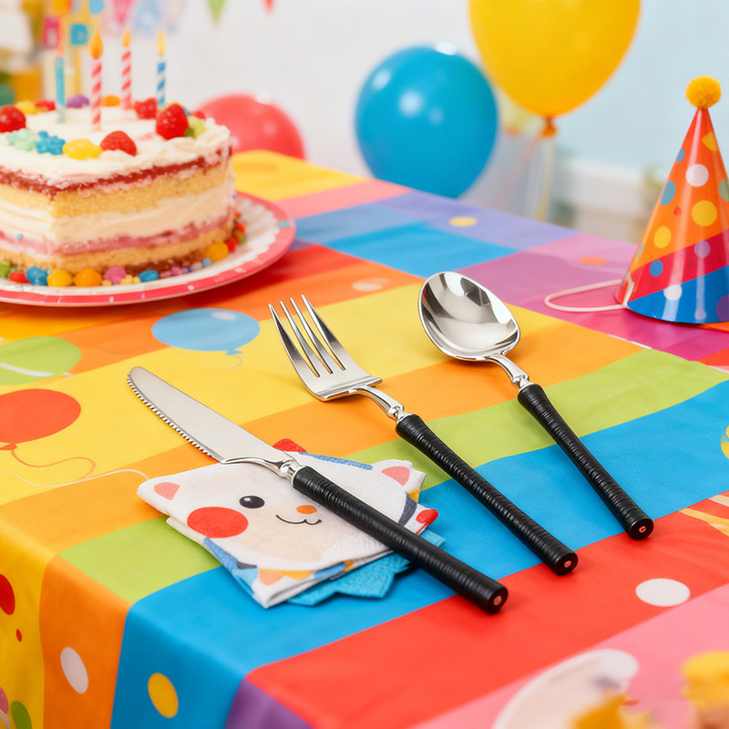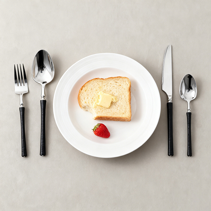 التصميم الوظيفي العملي: السكين تقطع اللحوم والكعك والمقبلات بسهولة؛ والشوكة تغرس السلطات والحلويات الصغيرة بإحكام؛ والملعقة تغرف الحساء والصلصات والحلويات بسلاسة - مناسبة لجميع أنواع احتياجات تناول الطعام في المناسبات.